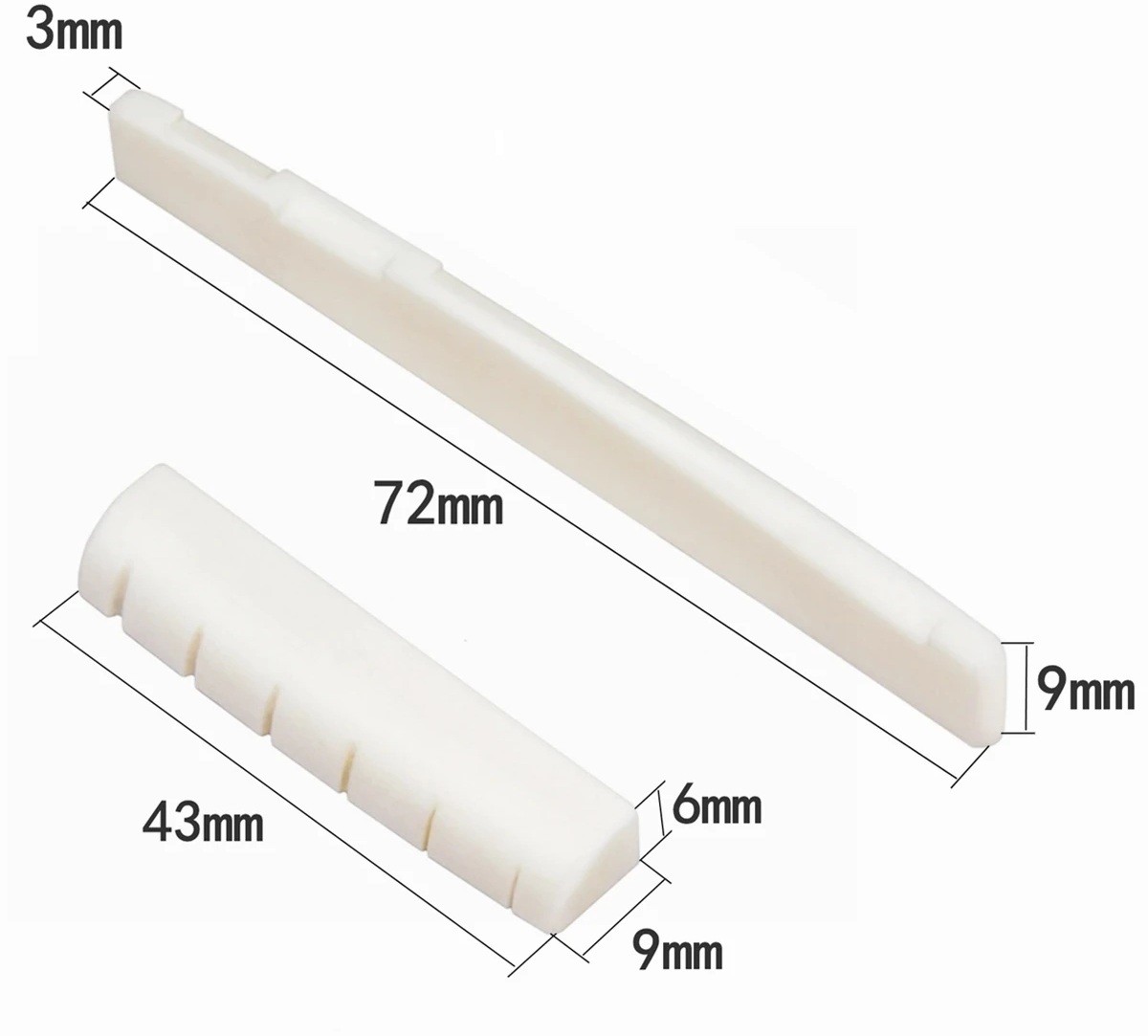 1 pár Kytarová kobylka 7,2 x 0,3 cm a nultý pražec 4,3 x 0,6 cm z hovězí kosti Barva bílá nebo nebělená Náhradní sada pro akustickou kytaru