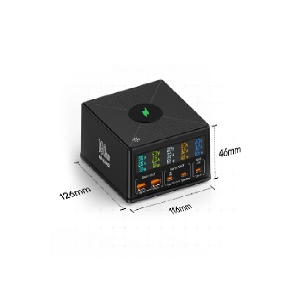 Tato výkonná nabíjecí stanice s celkovým výkonem 160 W představuje moderní řešení pro rychlé a bezpečné napájení více zařízení současně. Umožňuje kombinaci kabelového a bezdrátového nabíjení 15 W, takže snadno obslouží telefony, tablety i notebooky. Porty typu C podporují protokol PD až 65 W, což je ideální pro nabíjení MacBooku a dalších notebooků. USB-A porty obsahují technologii QC3.0 a protokoly FCP/SCP, které zajišťují vysokou kompatibilitu a rychlost pro mnoho značek mobilních telefonů. Stanice je vybavena přehledným LED displejem, jenž zobrazuje aktuální výkon každého portu a poskytuje okamžitý přehled o průběhu nabíjení.