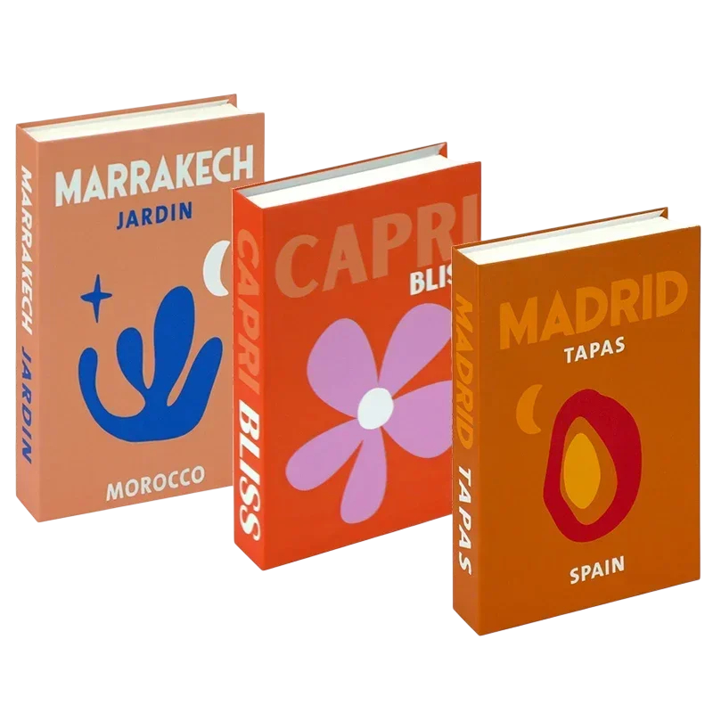 Tato sada tří falešných knih vyniká originálním ilustrativním designem inspirovaným ikonickými místy Marrakech, Capri a Madrid. Každá kniha je laděna do teplých barevných tónů a zdobena jednoduchými grafickými motivy, které evokují atmosféru cestování a jižních destinací. Díky svému boho a modernímu stylu působí knihy jako výrazný designový doplněk do interiéru. Jsou vyrobeny z papíru a slouží výhradně jako dekorace. Produkt je neotevíratelný a neobsahuje žádný čitelný obsah.