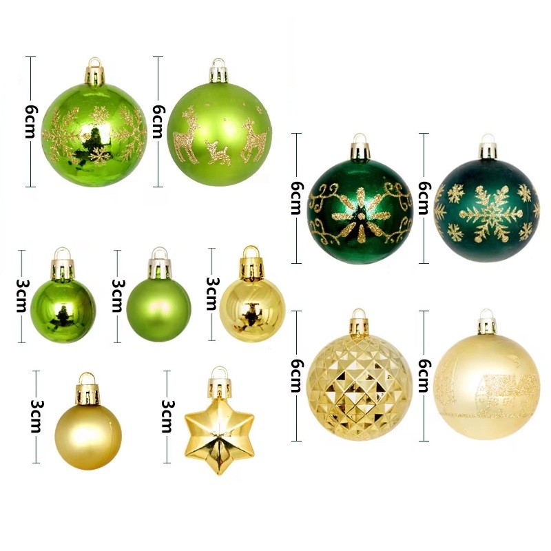 Jednotlivé ozdoby mají průměr 3 - 6 cm, což umožňuje jejich rovnoměrné rozmístění po celém stromku bez přetěžování větví. V sadě se nachází tvary koule a hvězdy, které patří mezi nejčastěji používané Vánoční motivy. Zeleno zlaté barevné provedení evokuje tradiční Vánoční atmosféru. Různé velikosti ozdob vytvářejí hloubku a prostorový efekt.