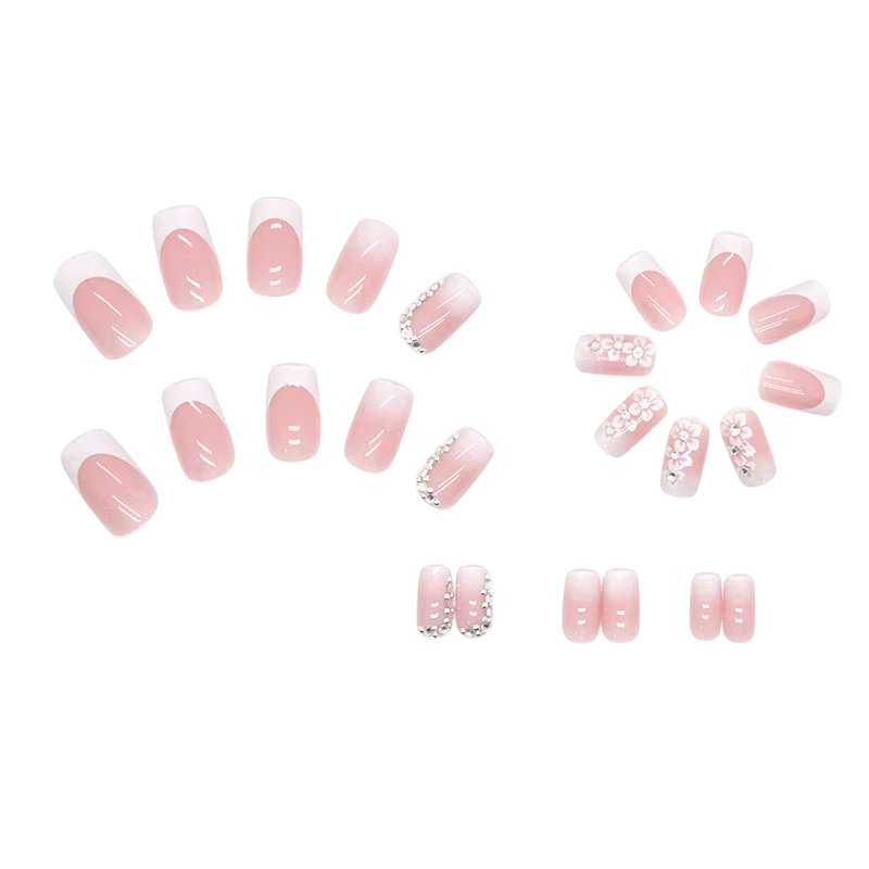 Elegantní nalepovací nehty s květinovým motivem, ombré přechodem a jemnými kamínky. Stylová manikúra pro běžné i slavnostní dny. Celý popis