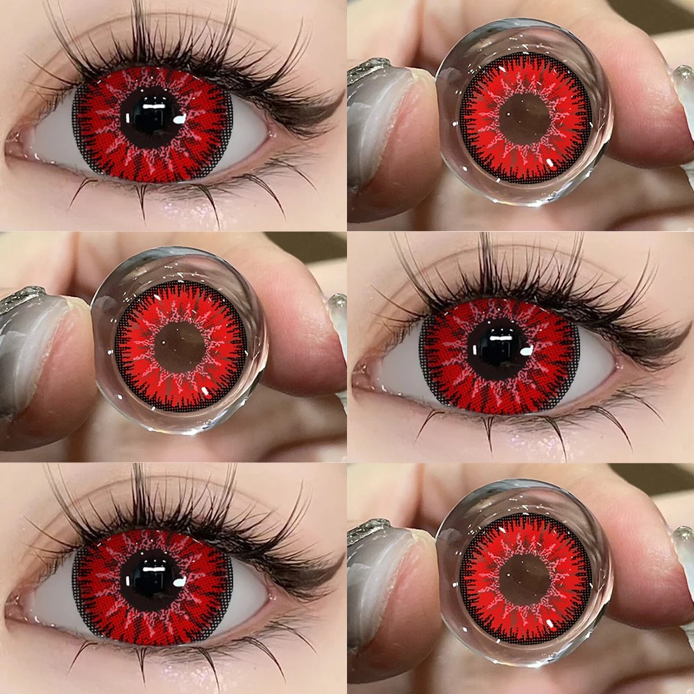Tyto barevné kontaktní čočky v červeném provedení zaujmou detailním zpracováním, které napodobuje přirozenou strukturu oka. Díky jemnému vzoru připomínajícímu oční žilky působí design velmi realisticky, zatímco výrazný černý okraj zvýrazňuje konturu oka a dodává pohledu intenzitu.