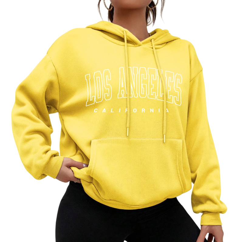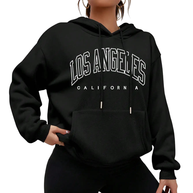 Dámská mikina s kapucí a kapsami Jednobarevná mikina s nápisem Los Angeles Pohodlný volnočasový svršek z měkkého polyesteru v různých barvách