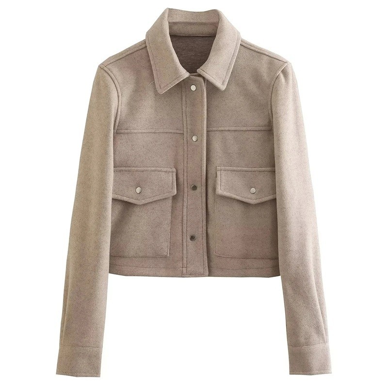 Dámská přechodová bunda se zapínáním na druky Stylová bunda do pasu s límcem Elegantní kabát s kapsami Jarní a podzimní sako