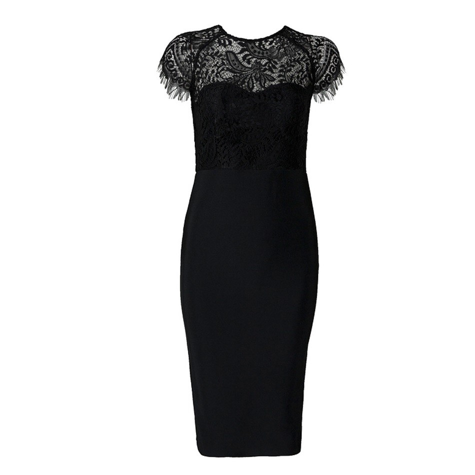 Večerní šaty bez rukávů zdobené elegantní krajkou.