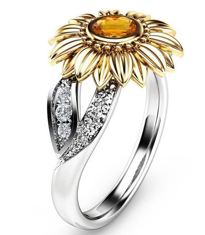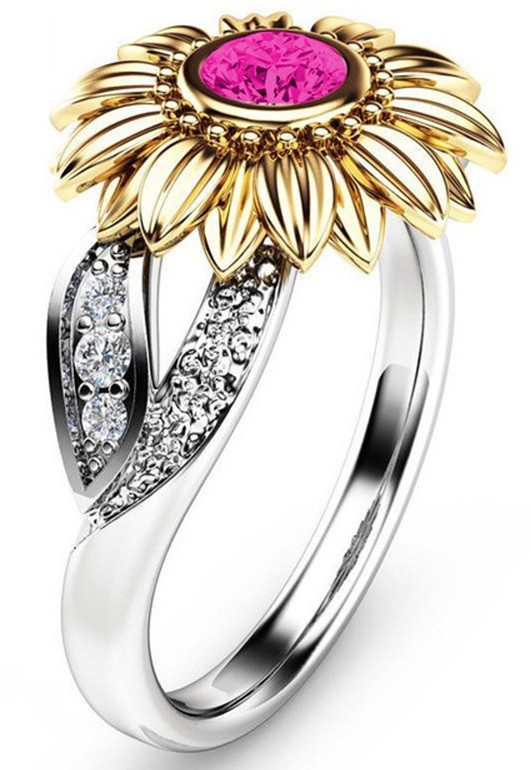 Tento prsten zdobí drobný elegantní květ s kamínkem uprostřed.