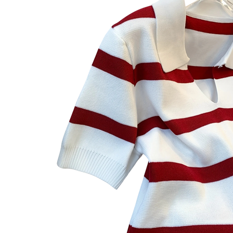 Dámský pruhovaný crop svetr s límečkem a krátkým rukávem Elegantní top z polyesteru v univerzální velikosti Módní pruhovaný design