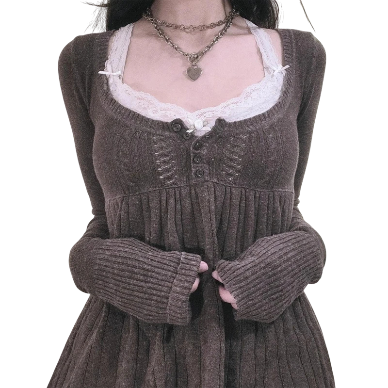 Dámský svetr s krajkou ve výstřihu do V Poloviční zapínání na knoflíky Elegantní jednobarevný svetr s dlouhým rukávem Různé barvy Polyester Bavlna