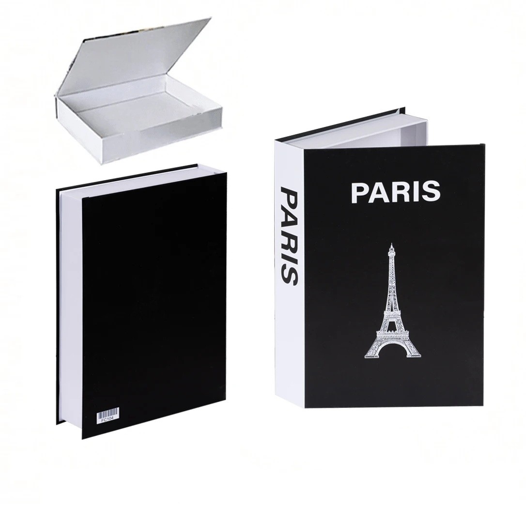 Dekorativní falešná kniha PARIS Otevíratelná skrýš s úložným prostorem Tajná schránka do knihovny Černo bílý design Eiffelova věž