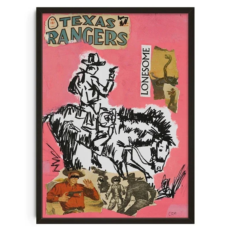 Designový plakát na zeď s westernovým motivem Texas Rangers zobrazuje jezdce na koni doplněného o kolážové prvky a výrazné barevné pozadí. Motiv vychází z tradiční westernové tematiky, která je zpracována moderním grafickým stylem. Díky tomu vzniká kontrast mezi klasickým námětem a současným vizuálním pojetím. Růžový podklad dodává plakátu výraznost a pomáhá mu vyniknout na stěně. Plakát je vhodný jako dekorace do různých typů interiérů.