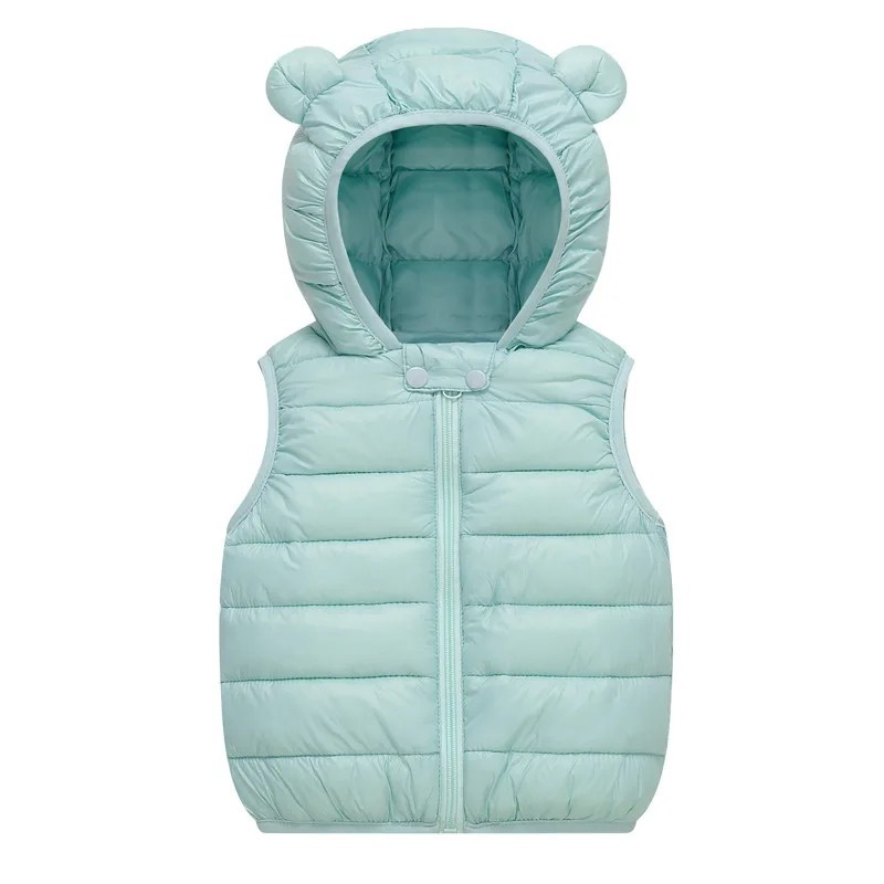 Dětská péřová vesta s kapucí s oušky Podzimní a zimní teplá bavlněná bunda pro batolata a dívky Jednobarevná vesta na zip z polyesteru a bavlny