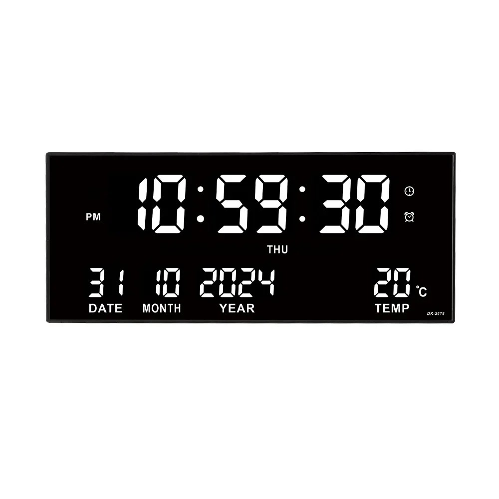 Digitální nástěnné hodiny s budíkem, teploměrem a kalendářem 150 x 360 x 30 mm Tento stylový digitální budík je perfektní volbou pro každou domácnost nebo kancelář, kde se požaduje přesnost a funkčnost v jednom designu. S rozměry 150 x 360 x 30 mm se hodiny hodí na většinu stěn a nabízejí přehledný a snadno čitelný displej. Díky integrovanému teploměru a kalendáři poskytují všechny důležité informace na jednom místě. Digitální displej zaručuje rychlý přehled o čase a dalších funkcích, což usnadňuje každodenní používání. Elegantní černý design se hodí do moderního interiéru a snadno zapadne do každé místnosti.
