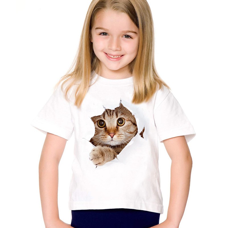 Na přední straně trička je kočka, která vylézá z trička a vypadá velice realisticky.