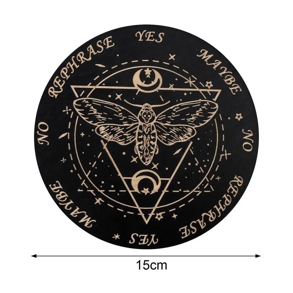 Dřevěná kyvadlová deska 15 cm Věštecká tabulka s motivem můry a měsíce Esoterická pomůcka pro věštění z kyvadla Spirituální dekorace