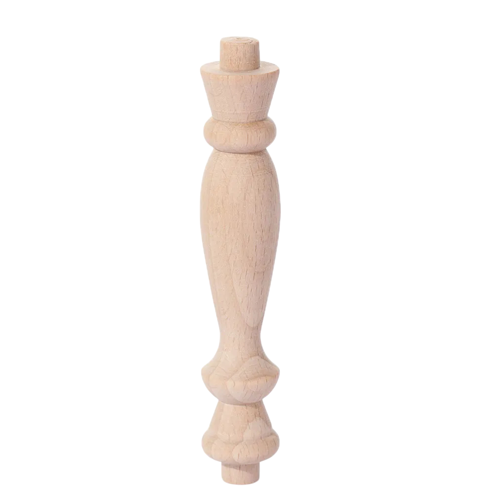 Tvar nohy je výsledkem detailního soustružení, které vytváří plynulé přechody mezi jednotlivými částmi. Soustružený tvar s ozdobnými prvky dodává noze dekorativní vzhled bez narušení její funkčnosti. Přírodní světlé dřevo zachovává přirozenou kresbu materiálu, která se může lišit kus od kusu. Povrch je hladký a vhodný pro další úpravy, například lakování, moření nebo olejování podle konkrétních požadavků.