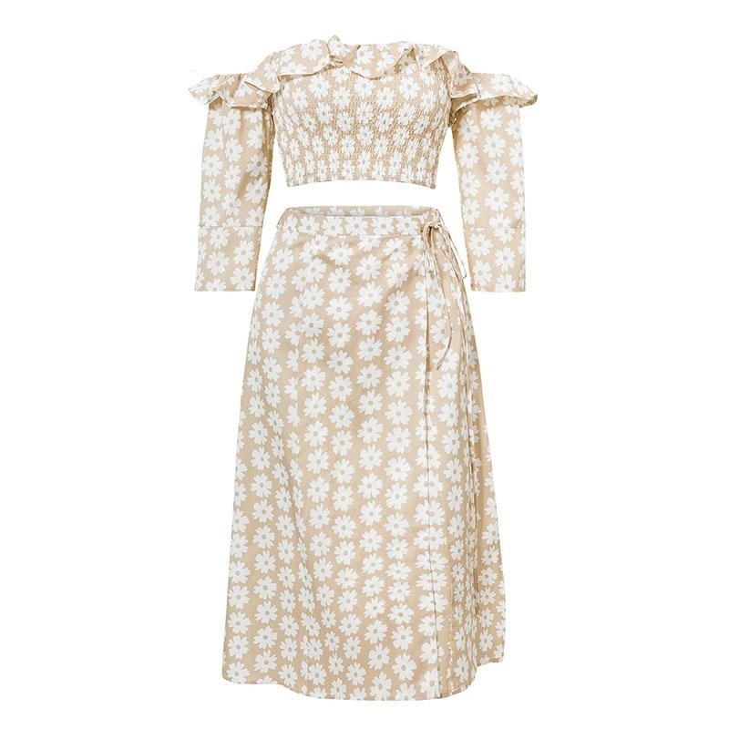 Top s odhalenými rameny a zavinovací sukně v midi délce.