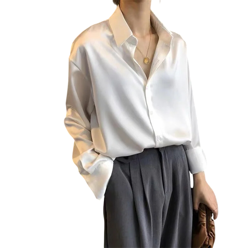 Elegantní dámská halenka z jemného saténu s dlouhým rukávem Volná košile s límečkem Stylový top na knoflíky do práce i na večer