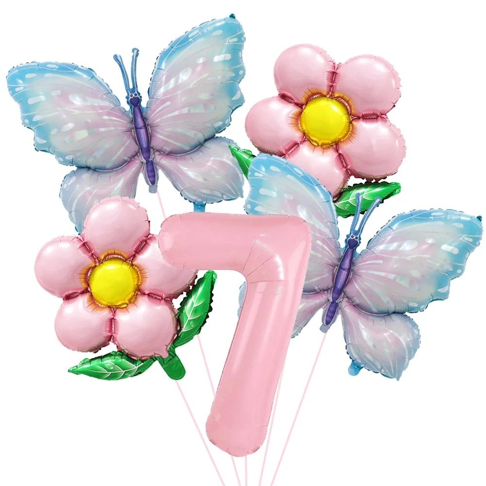 Foliové balónky číslo 7 s motýlky a květinami 81,3 cm a 45,7 cm Foliové balónky růžová modrá narozeninová dekorace na oslavu