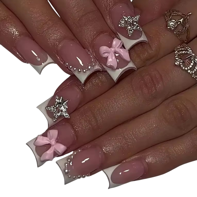 Tato stylová sada francouzských umělých nehtů je určena pro ženy a dívky, které chtějí dosáhnout jemného, ale zároveň poutavého vzhledu bez nutnosti návštěvy salonu. Čtvercový tvar působí moderně a upraveně, zatímco kombinace hvězdiček, perličkových kamínků a roztomilých mašliček dodává manikúře elegantní a hravou atmosféru. Díky 12 různým velikostem je možné snadno vybrat ideální tip pro každý prst, což zajišťuje přirozené usazení a pohodlné nošení. Akrylový materiál poskytuje realistický vzhled a stabilitu při každodenním používání. Sada je vhodná jak pro domácí manikúru, tak pro profesionální nehtové salony a zvládnou ji i úplné začátečnice.