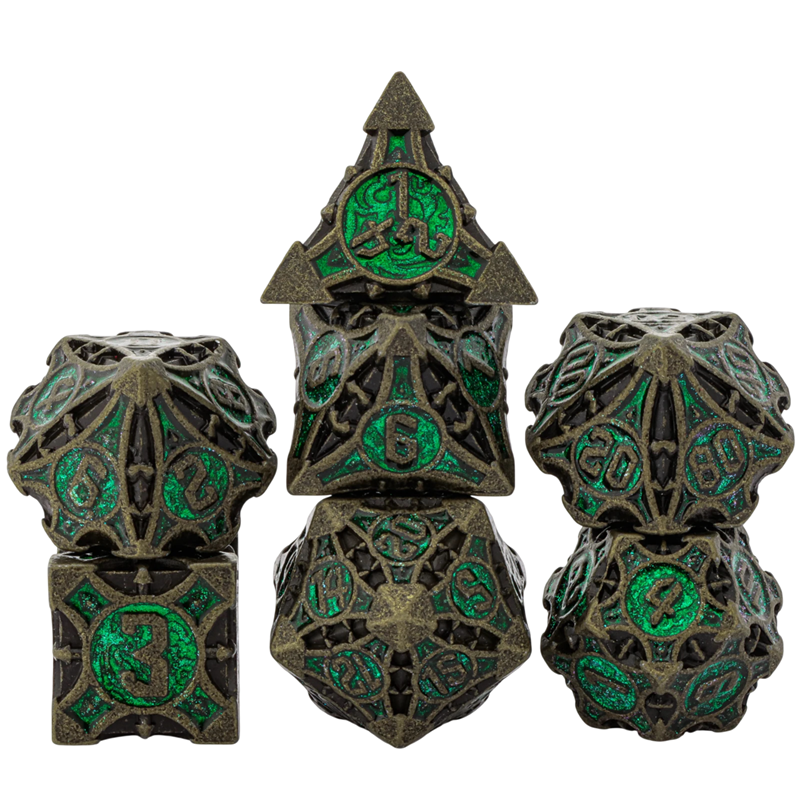 Mnohostěnné kostky s ostrými hranami jsou ceněny pro jasnou definici tvarů a rovnoměrné rozložení hmotnosti. Tato sada nabízí kompletní kombinaci kostek potřebných pro běžné herní mechaniky fantasy a roleplay her a snadno se kombinuje s různými herními styly.