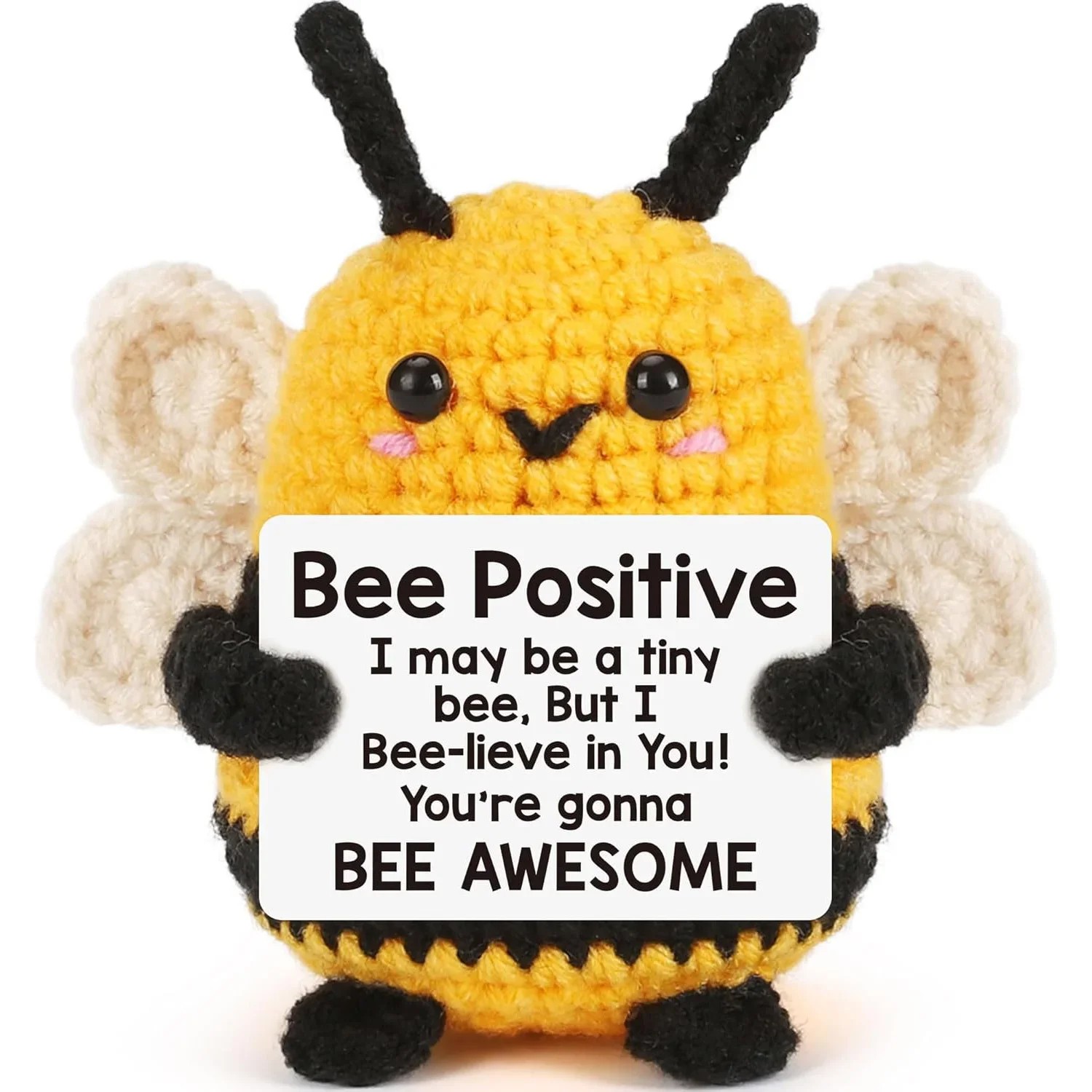 Háčkovaná včelka s motivačním vzkazem Roztomilá textilní figurka pro pozitivní energii a motivaci Tato ručně háčkovaná včelka je ideálním dárkem pro každého, kdo potřebuje trochu pozitivní energie a motivace. Díky jemnému zpracování a kvalitnímu textilnímu materiálu je včelka nejen roztomilá, ale také velmi příjemná na dotek. Včelka drží cedulku s vzkazem: „Můžu být malá včelka, ale věřím v tebe. Půjdeš za svými sny – jsi úžasná!“. Tento pozitivní vzkaz dodává každému, kdo ji má, podporu a motivaci pro každý den.
