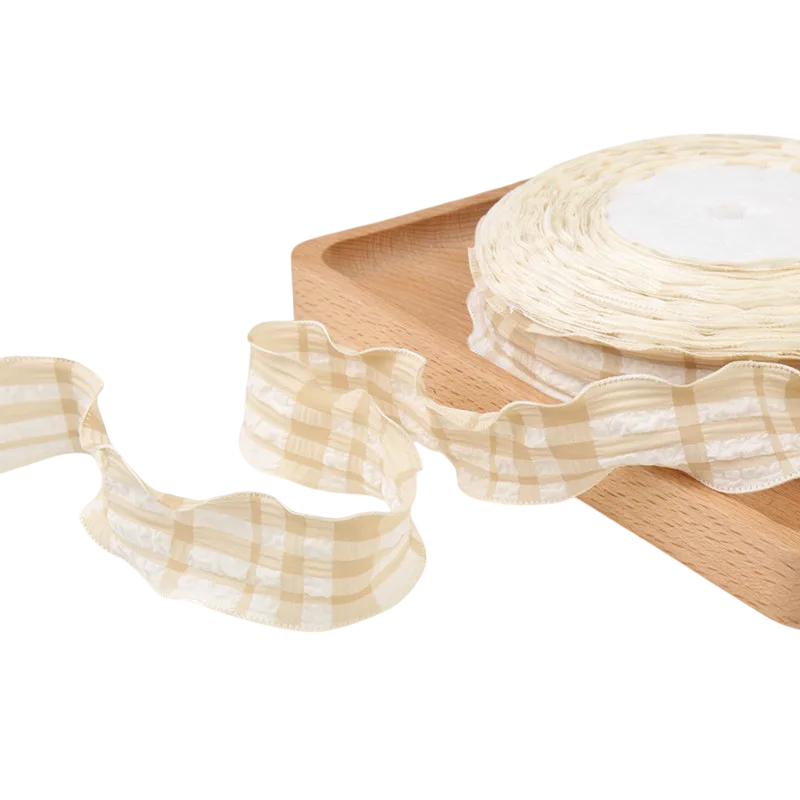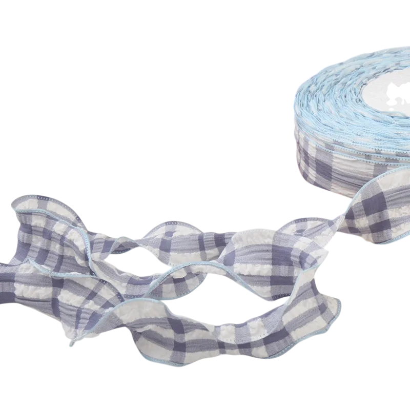 Tato dekorativní stuha představuje jednoduchý způsob, jak dodat výrobkům zajímavý textilní detail. Kostkovaný vzor v kombinaci s vlnitým okrajem vytváří dekorativní prvek, který může oživit různé druhy textilních výrobků.