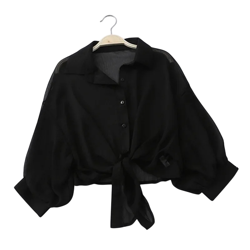 Krátká dámská košile s uzlem vpředu Průsvitná halenka Crop střih Lehký vzdušný materiál Zapínání na knoflíky Stylový letní top