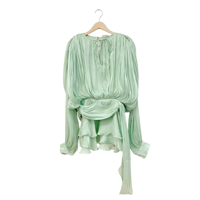 Tyto elegantní minišaty v jemném odstínu jsou dokonalou volbou pro každou příležitost, kdy chceš zazářit. Kombinace objemného vršku s balónovými rukávy a lehce volánové sukně vytváří jedinečný a půvabný siluetový efekt. Vršek má hlubší výstřih s decentním vázáním u krku, které dodává nádech sofistikovanosti. Šaty jsou z lehkého, splývavého materiálu, který působí luxusně a zároveň se pohodlně nosí. Díky zavinovacímu pásku v oblasti pasu lze šaty snadno přizpůsobit postavě.