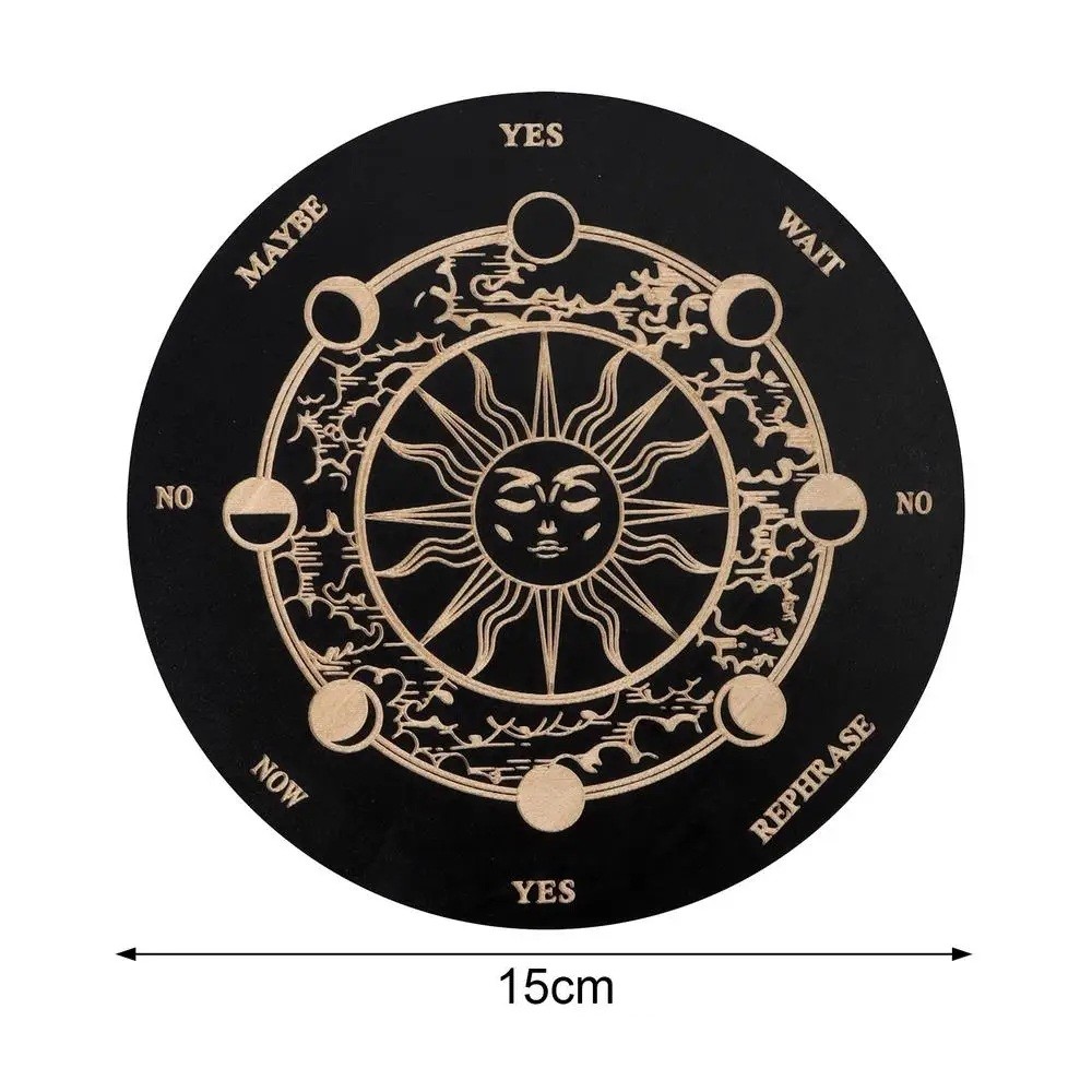 Kyvadlová dřevěná věštecká tabulka 15 cm Esoterická deska se symbolem slunce a lunárních fází Pomůcka pro práci s kyvadlem