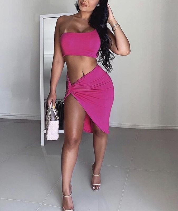Top na jedno rameno, sukně s vysokým rozparkem.