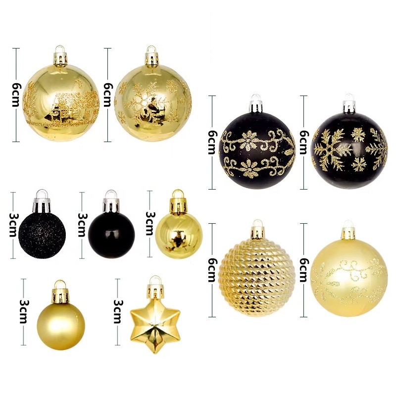 Ozdoby mají průměr 3 - 6 cm, což je praktická velikost umožňující jejich rovnoměrné rozmístění po celém stromku. V sadě jsou zastoupeny tvary koule a hvězdy, které patří mezi tradiční Vánoční motivy. Černo zlaté barevné provedení působí elegantně a výrazně. Různé velikosti ozdob vytvářejí prostorový efekt. Vánoční ozdoby lze využít nejen na stromeček, ale také pro dekoraci svátečních věnců, stolů, polic, oken nebo moderních aranžmá v interiéru. Díky lehkému provedení se snadno zavěšují a jsou vhodné pro každoroční použití.