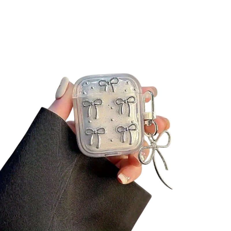 Magický stříbrný kryt pro AirPods 3 s mašlí a přívěskem Ochranný měkký průhledný kryt s jedinečným šarmem pro sluchátka Tento
