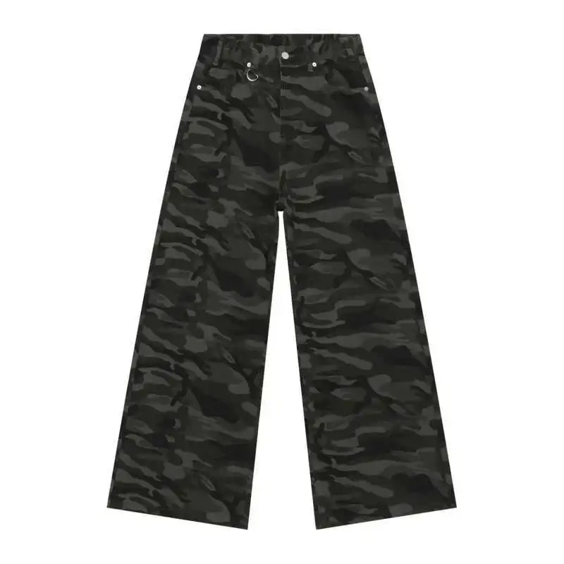 Maskáčové rovné pánské džíny s kovovým kroužkem Široké dlouhé nohavice Streetwear kalhoty Army styl Ležérní pánské jeansy