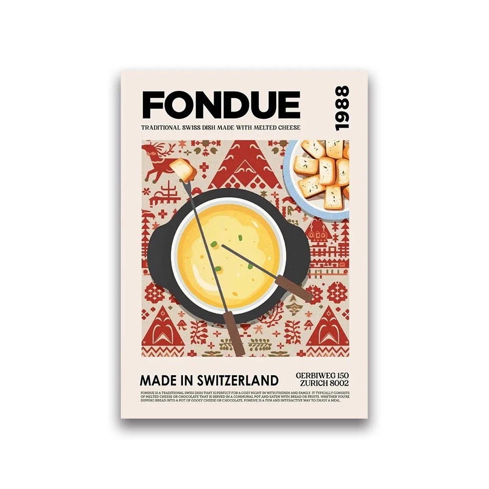 Plakát je navržen jako měkký plakát, který lze snadno připevnit na stěnu nebo vložit do rámu podle stylu interiéru. Motiv fondue a švýcarské kuchyně vytváří tematickou nástěnnou dekoraci vhodnou pro domácnosti i gastronomické podniky. V restauracích nebo bistrech může takový motiv doplnit atmosféru interiéru a vizuálně podpořit kulinářské zaměření prostoru. Ilustrační zpracování motivu kombinuje gastronomický prvek s jednoduchými grafickými tvary. Motiv fondue inspirovaný švýcarskou kuchyní tak může být zajímavým doplňkem prostoru zaměřeného na jídlo nebo kulinářskou tematiku.