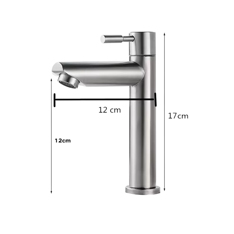 Tato nerezová ocelová umyvadlová baterie o rozměrech 17 x 12 cm kombinuje jednoduchost, funkčnost a moderní design. Je určena pro použití se studenou vodou a díky své odolné konstrukci z nerezové oceli nabízí dlouhou životnost a spolehlivý provoz. Pákové ovládání umožňuje snadné a přesné regulování průtoku vody. Díky univerzálnímu stylu se hodí jak do kuchyní, tak i do koupelen, kancelářských umyvadel či technických místností.