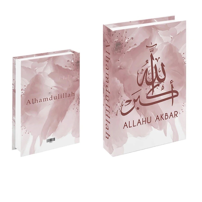Tato dekorativní falešná kniha v jemném růžovém provedení zaujme romantickým květinovým motivem a výraznou kaligrafií Allahu Akbar na přední straně. Zadní část je doplněna nápisem Alhamdulillah, což dodává celému designu symbolický a harmonický charakter. Na první pohled působí jako klasická kniha do knihovny, ve skutečnosti však ukrývá tajný úložný prostor, který umožňuje bezpečně uschovat vaše drobné cennosti. Elegantní barevné ladění v růžových tónech působí jemně a zároveň luxusně.