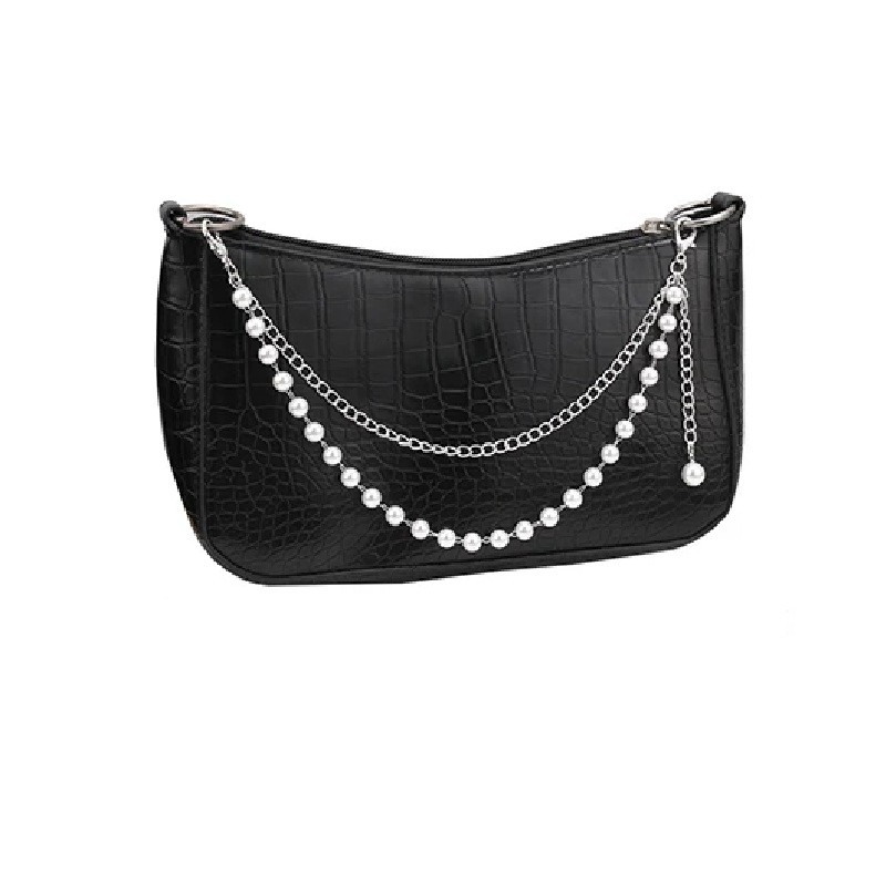 Celý doplněk je vyroben z kovové slitiny, která tvoří kovové články řetězu i spojovací části. Povrch řetízku má stříbrnou barvu, která může ladit s různými typy kabelek i dalšími módními doplňky. Perlová linie vytváří dekorativní prvek, který může kabelce dodat zajímavý vzhled.