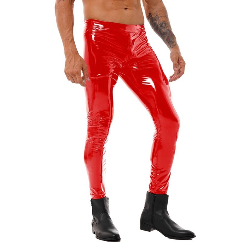 Moderní pánské lesklé kalhoty z lakované kůže v úzkém střihu se zipem v rozkroku, ideální pro výrazný styl, večírky i odvážné outfity. Celý popis
