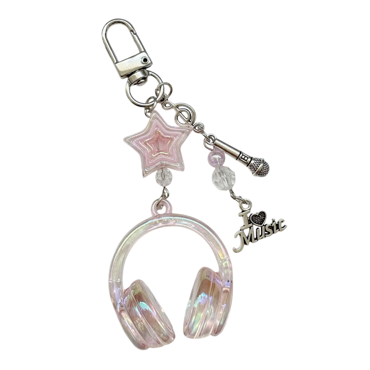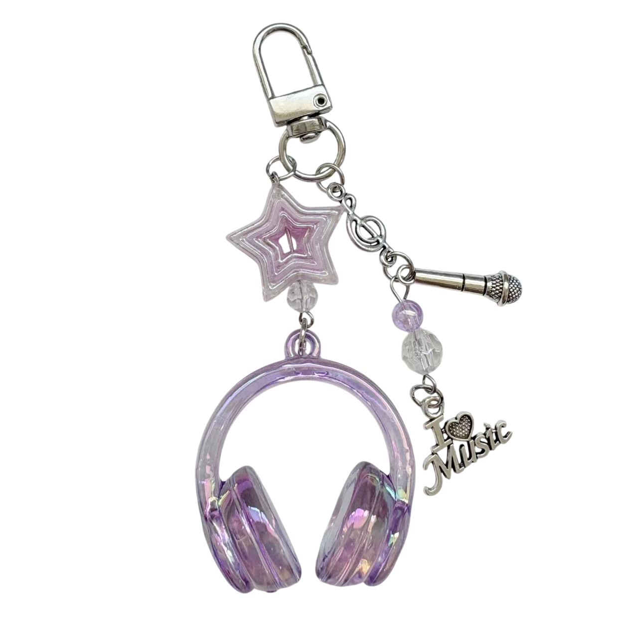 Tento model vyniká transparentním provedením, které působí moderně a atraktivně. Motiv sluchátek doplňuje mini mikrofon a dekorativní hvězda, což z něj činí výrazný hudební symbol. Vyroben je z odolného plastu, který je lehký, ale dostatečně pevný pro běžné používání. Velikost přibližně 5 cm zajišťuje, že přívěsek nepřekáží v kapse ani tašce. Praktický kovový kroužek umožňuje snadné připevnění ke klíčům, batohu, penálu či kabelce.