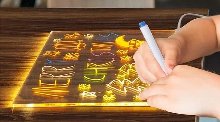 Součástí balení je sada sedmi barevných fixů, které umožňují vytvářet pestré obrázky, nápisy nebo poznámky. LED osvětlení zvýrazňuje barvy a dodává kresbám atraktivní vzhled. Napájení je možné jak pomocí kabelu, tak i baterií, což zajišťuje maximální flexibilitu použití bez ohledu na dostupnost zásuvky. Deska může sloužit nejen ke kreslení, ale také jako poznámková tabulka, plánovač nebo výuková pomůcka. Díky hladkému povrchu je mazání rychlé a nezanechává šmouhy.