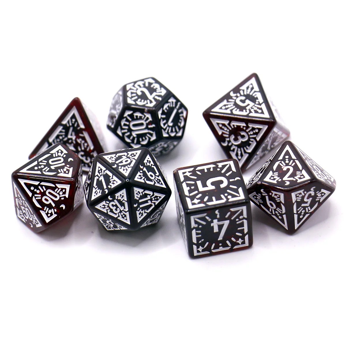 Průsvitné herní kostky 7 ks Temně červené fantasy kostky pro Dračí doupě RPG stolní hry a herní večery