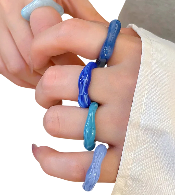 Stylová sada modrých prstýnků z pryskyřice s nepravidelným designem. Lehký a odolný materiál vhodný pro každodenní nošení i cestování bez kompromisů. Celý popis