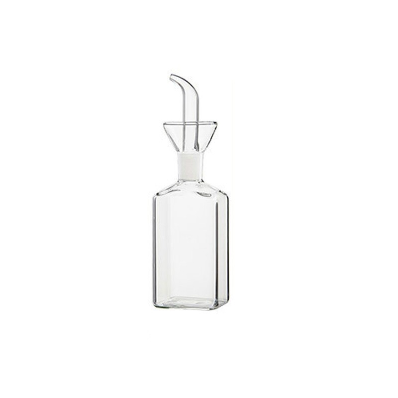 Skleněná lahev se širokým hrdlem a dlouhou nálevkou.
