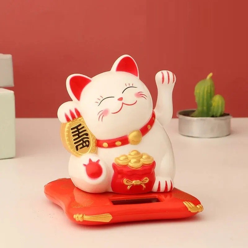 Tato japonská kočka štěstí Maneki Neko je tradičním symbolem prosperity, úspěchu a dobré energie. Pravá tlapka se plynule kývá, zatímco levá ruka drží minci a vak se zlaťáky. Mince nese kaligrafii „招財“ (přilákat bohatství). Kočka je napájena solárně, takže nepotřebuje baterie. Kompaktní rozměry cca 7,5 × 6,5 cm usnadní umístění na stůl či pult.