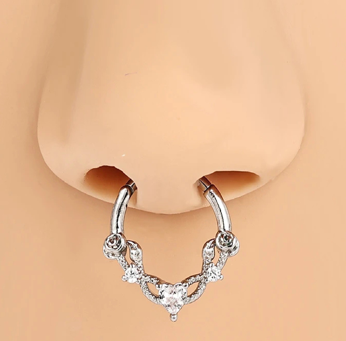Kulatý stříbrný piercing se srdcovým motivem a jemnými detaily z nerezové oceli, vhodný pro běžné nošení i kombinaci s dalšími šperky. Celý popis
