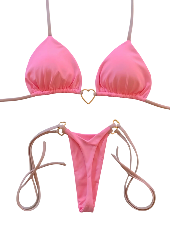 Tanga bikiny s trojúhelníkovým topem a kovovým srdcem Minimalistické dámské plavky s vázáním na šňůrky Sexy plážový outfit