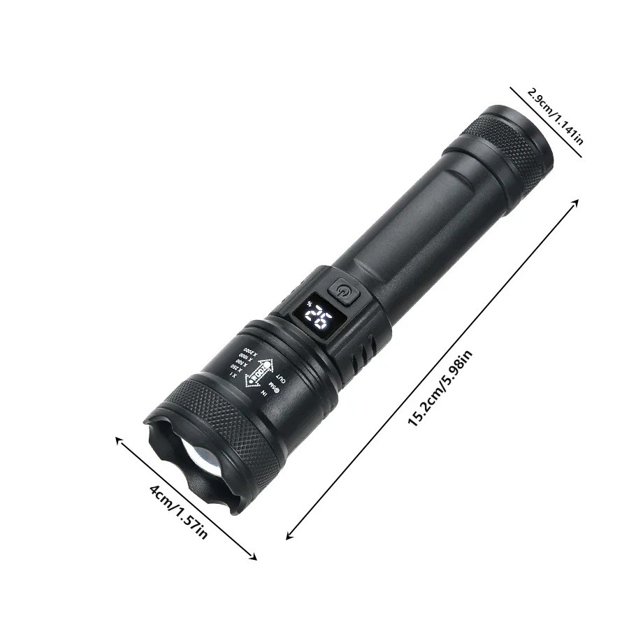 Výkonná LED svítilna 2000 lm 15 x 4 cm Nabíjecí USB taktické světlo se zoomem a displejem pro kempování i nouzi