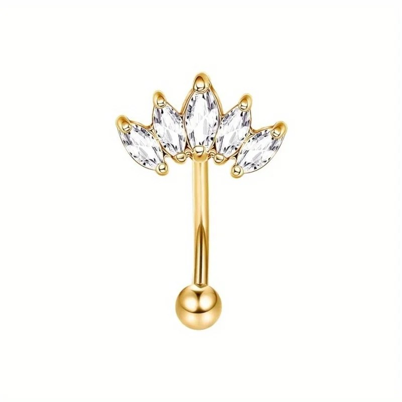 Tento zlatý piercing z nerezové oceli zaujme čistým a elegantním designem doplněným o pět jemných diamantů, které tvoří harmonický celek. Diamanty jsou uspořádány tak, aby vytvářely vyvážený vizuální efekt bez zbytečné okázalosti. Díky kompaktním rozměrům 8 x 1,2 mm působí šperk decentně a je vhodný pro každodenní nošení. Zlaté provedení podtrhuje jemný lesk kamenů a dodává piercingu nadčasový charakter. Celkové zpracování je navrženo s důrazem na jednoduchost a eleganci.